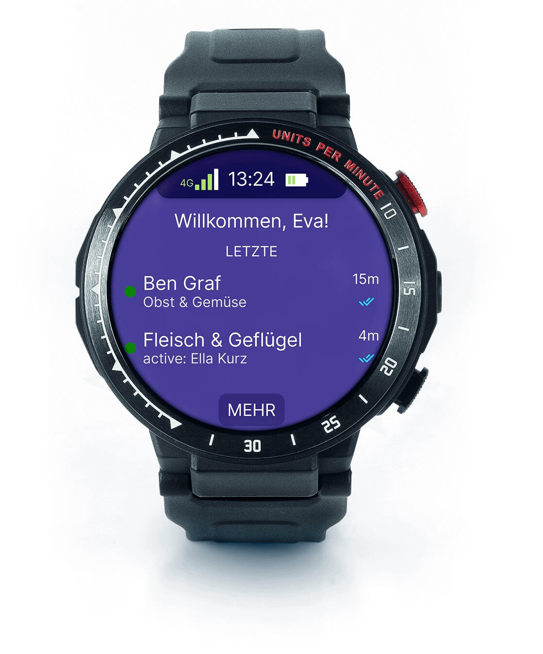 Jeder Mitarbeiter kann sich bei jedem der verfügbaren cWatches anmelden – daher benötigen Sie nur die Anzahl an Geräten, die für eine Schicht benötigt wird. Alternativ können Sie jedem Mitarbeiter eine eigene cWatch zuweisen.